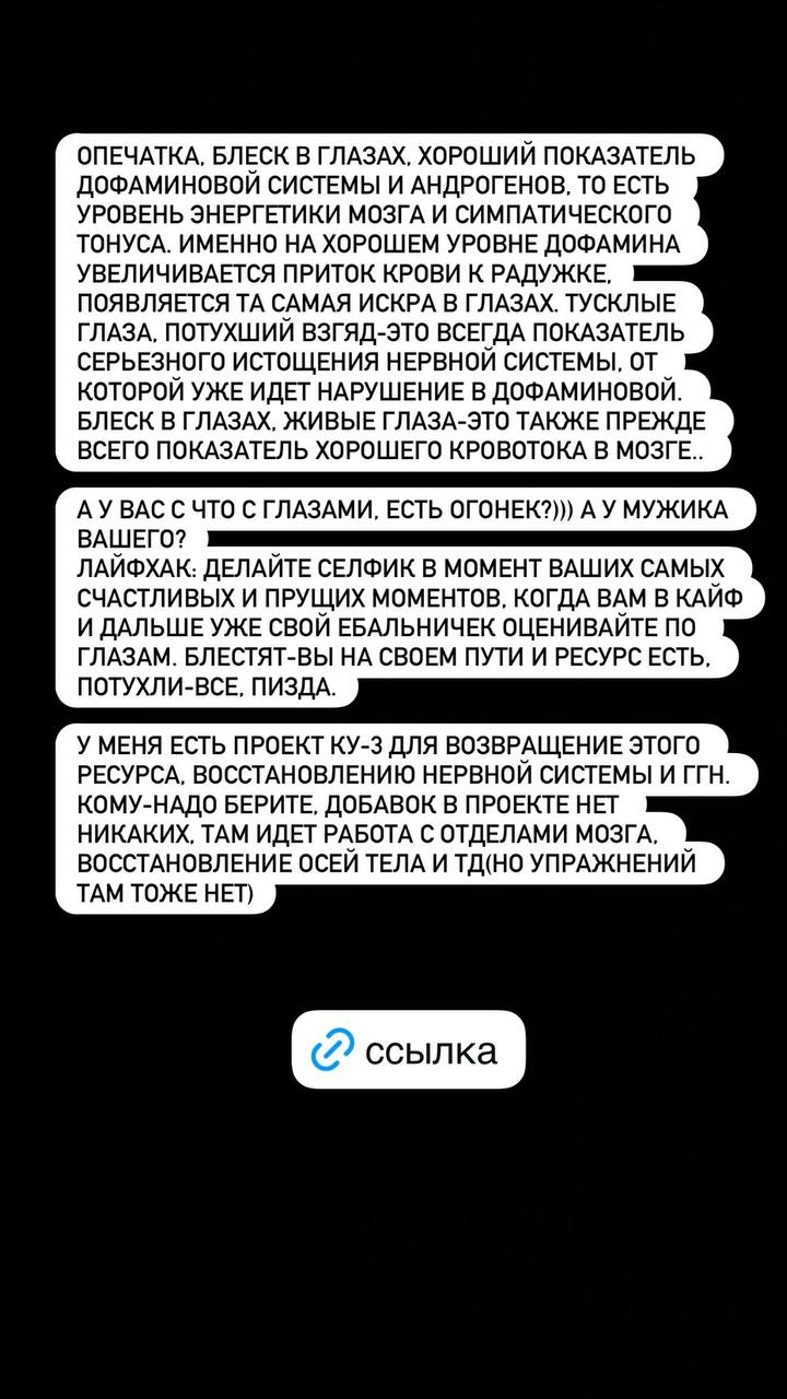 Лайфхак: делайте селфи в моменты ваших самых счастливых и кайфовых моментов. Потом оценивайте свои глаза по ним. Блестят — вы на своем пути и ресурс есть. Потухли — все, конец. Кстати, у меня есть проект «Канальное удовольствие — 3», как раз по возвращению этого утерянного ресурса, восстановлению нервной системы.