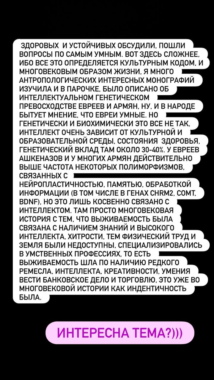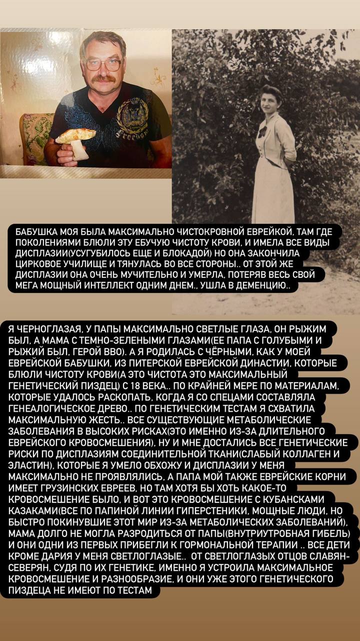 Я — черноглазая. У папы были максимально светлые глаза, он был рыжим. А у мамы — темно-зеленые. А я родилась с черными глазами, как у моей еврейской бабушки. По генетическим тестам я получила максимальную жесть: все существующие метаболические заболевания в высоких рисках (это из-за длительного еврейского кровосмешения), и все риски по дисплазия (слабый коллаген и эластин).