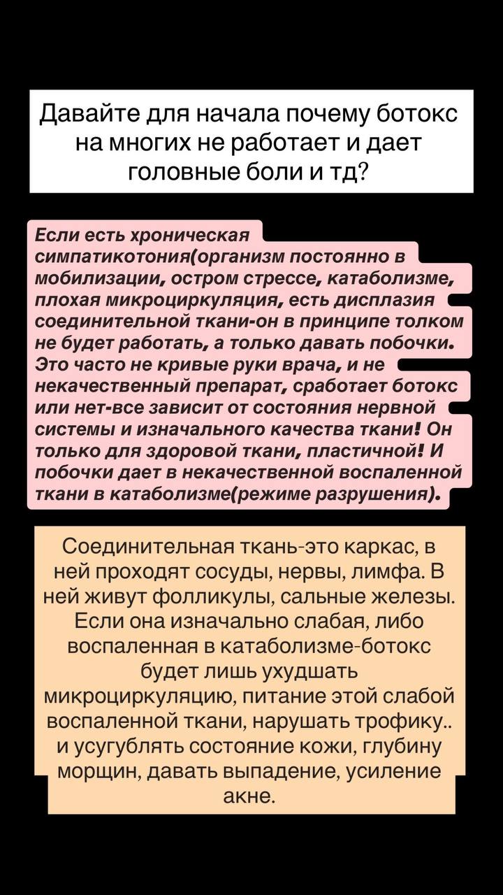Ботокс не снижает общую тревожность нервной системы, не восстанавливает вегетатику. Ботокс при мигрени и хронических болях снижает поток раздражающих сигналов в мозг, но не восстанавливает нарушенную регуляцию, из-за чего остаётся костылём, а не решением. А для бьютификации ботокс имеет место быть для здоровой ткани!