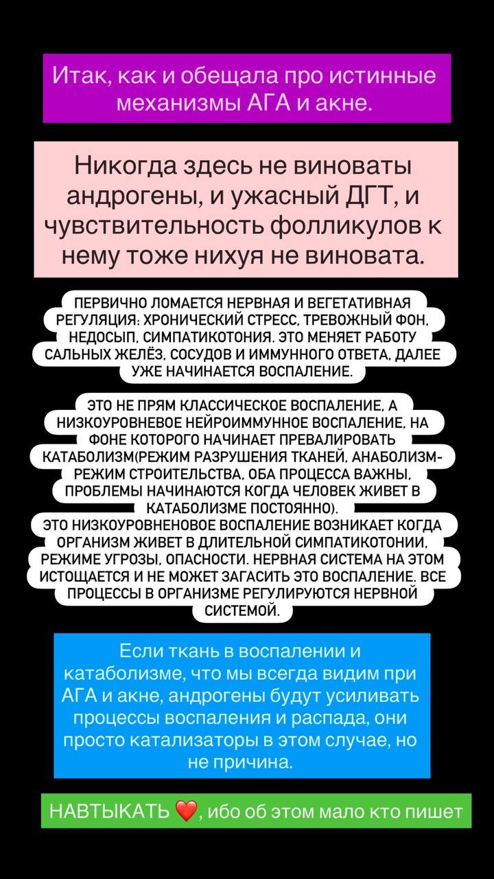 Если ткань в воспалении и катаболизме, что мы всегда видим при АГА и акне, андрогены будут усиливать процессы воспаления и распада, они просто катализаторы в этом случае, но не причина.