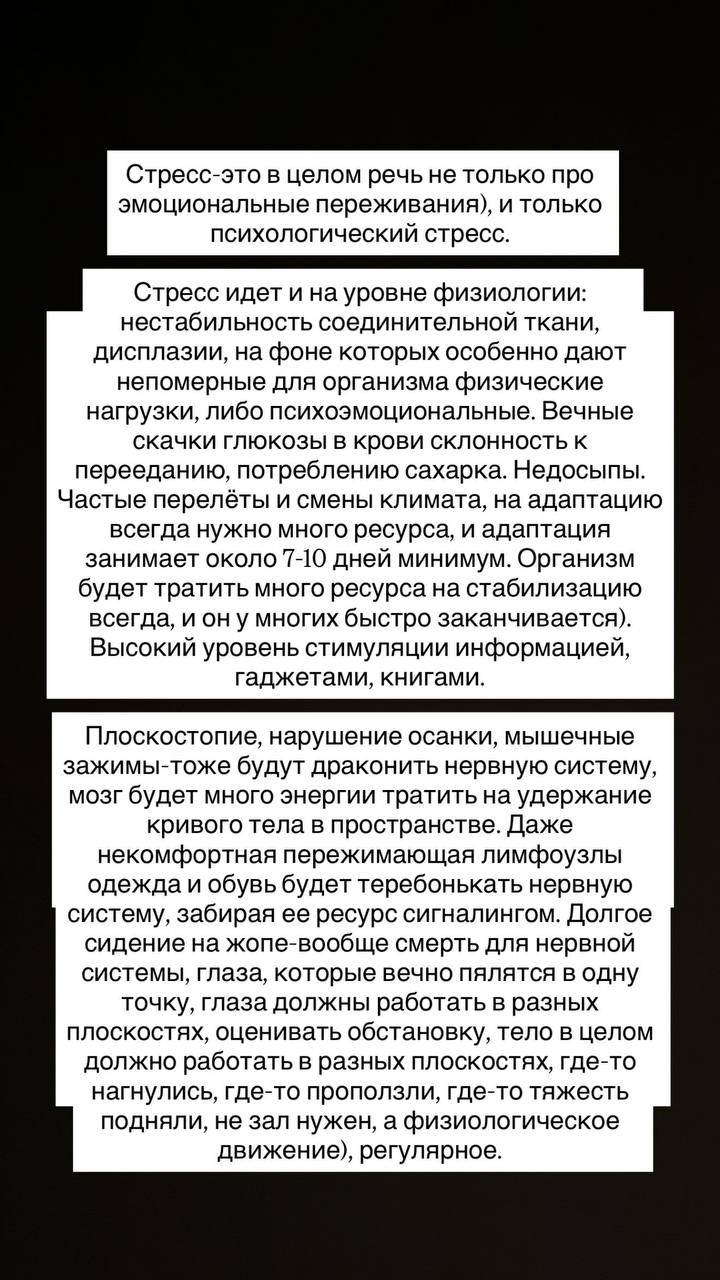 Стресс — это в целом речь не только про эмоциональные переживания или только психологический стресс. Стресс идет и на уровне физиологии: нестабильность соединительной ткани, дисплазии, на фоне которых особенно дают непомерные для организма физические нагрузки либо психоэмоциональные. Вечные скачки глюкозы в крови и склонность к перееданию, потреблению сахара. Недосыпы. Частые перелеты и смены климата: на адаптацию всегда нужно много ресурса, и адаптация занимает около 7−10 дней минимум. Организм будет тратить много ресурса на стабилизацию всегда, и он у многих быстро заканчивается. Высокий уровень стимуляции информацией, гаджетами, книгами.
