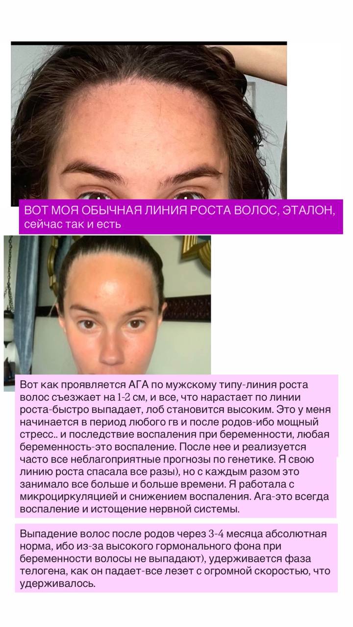 А вот как проявляется АГА по мужскому типу — линия роста волос «съезжает» на 1−2 см, и все, что нарастает по линии роста, быстро выпадает, лоб становится высоким.