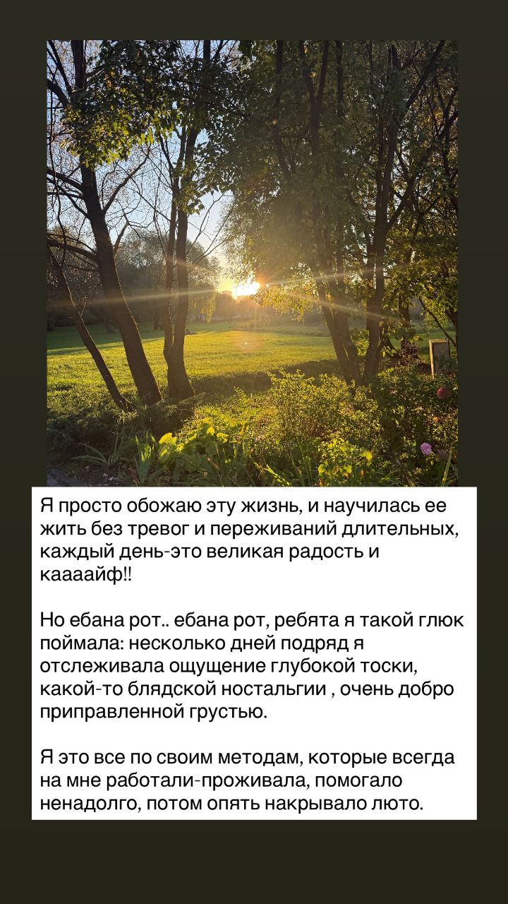 Начну с истории. Я просто обожаю эту жизнь, и научилась ее жить без тревог и переживаний длительных, каждый день — это великая радость и кайф! Но не так давно несколько дней подряд я отслеживала ощущение глубокой тоски, какой-то ностальгии, очень щедро приправленной грустью. По своим методам, которые всегда на мне работали, я это проживала, помогало ненадолго, потом опять накрывало люто.