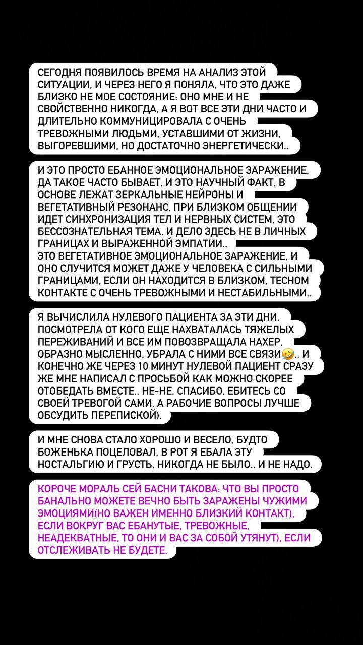 В общем, я вычислила «нулевого пациента» (термин из эпидемиологии, означает того, с кого всё началось) за эти дни, посмотрела, от кого еще нахваталась тяжелых переживаний, и всё им «вернула». Конечно же, через 10 минут «нулевой пациент» сразу же мне написал с просьбой как можно скорее отобедать вместе. Но нет, спасибо, отстаньте от меня со своей тревогой, а рабочие вопросы лучше обсудим в переписке. И мне снова стало хорошо и весело, будто боженька поцеловал.