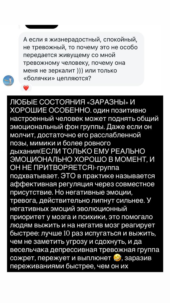 Поступил вопрос от подписчицы: «А если я жизнерадостный, спокойный, нетревожный человек, то почему это не особо передается живущему со мной тревожному человеку? Почему она меня не зеркалит? Или только „болячки“ цепляются?». Ответ: любые состояния «заразны»! Эволюционно этот механизм возник для того, чтобы стая действовала как единое целое.