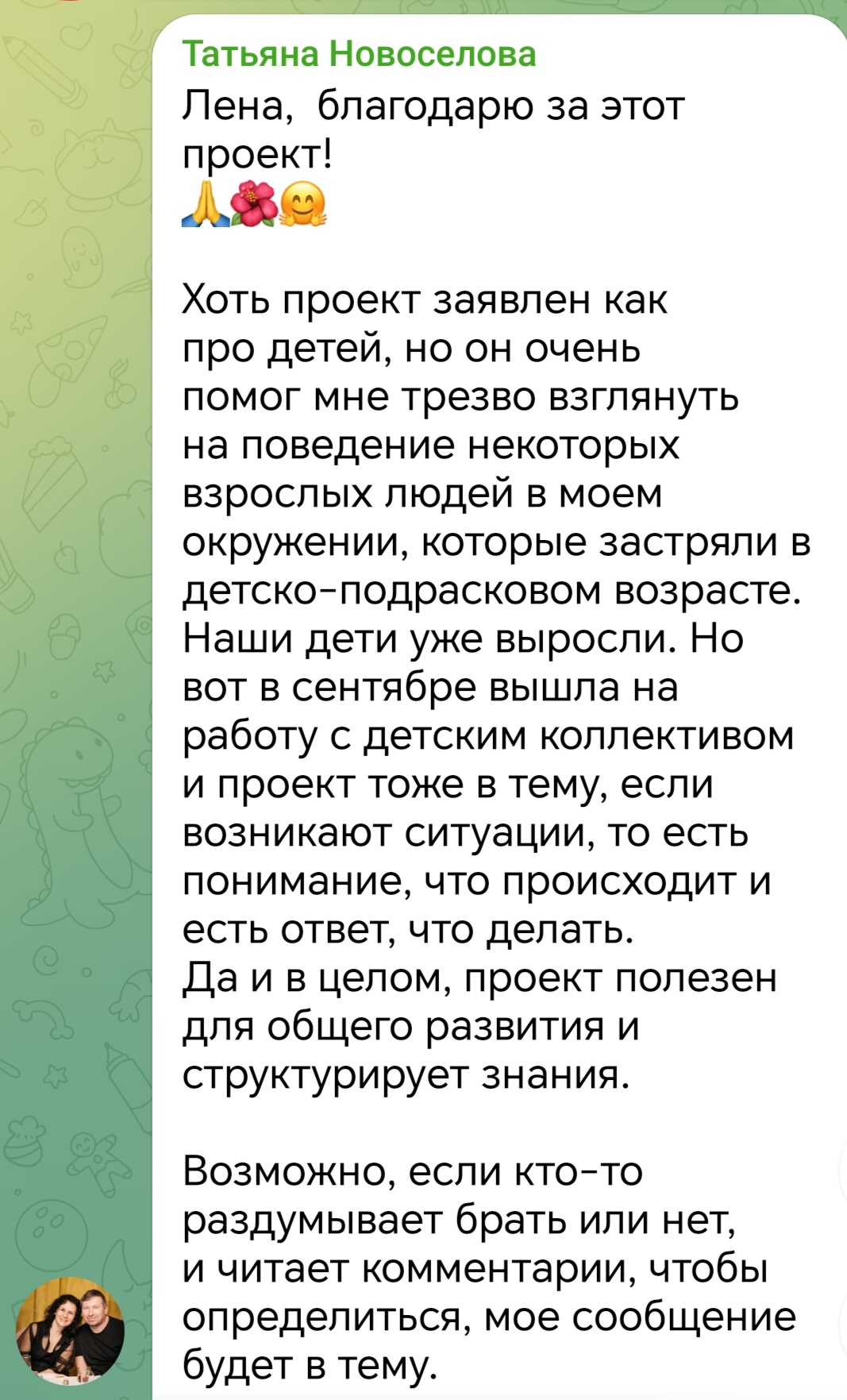 Этот проект не для тех родителей, кто хочет воспитать успешного ребенка, победителя победителей, перекинув на него все свои проекции и амбиции, взращивая свою самооценку и нарциссически расширяясь через его успехи. Если для вас важно, чтобы ребенок был таким, каким вы его видите в своих влажных фантазия — займитесь своей кукухой и своей реализацией.