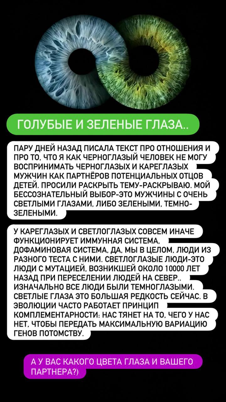 Как только я написала в своём блоге о том, что как черноглазая женщина я не могу воспринимать кареглазых мужчин как потенциальных партнеров и отцов детей (мой бессознательный выбор, у которого есть глубокие биологические причины, - мужчины с очень светлыми глазами, либо зелеными, темно-зелеными), меня тут же засыпали вопросами: «Почему? Раскрой тему!». Что ж, раскрываю. Из этого материала узнаете, как цвет глаз, а также происхождение связаны со здоровьем, интеллектом и как ваш внутренний компас ищет «того самого».