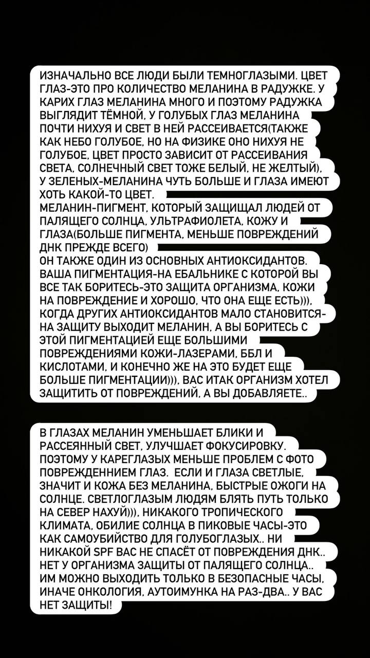 В глазах меланин уменьшает блики, улучшает фокусировку. Поэтому у кареглазых меньше проблем с фото-повреждением глаз. А если глаза светлые, значит, и кожа, скорее всего, светлая, без защиты. Таким людям, если честно, прямая дорога на север. Никакого тропического климата! Обилие солнца в пиковые часы — это самоубийство для голубоглазых. Никакой SPF не спасет от повреждения ДНК, если у организма нет своей, внутренней защиты. Итог — онкология и аутоиммунные заболевания на раз-два.