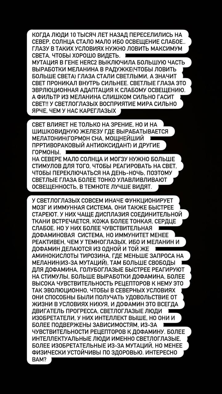 Цвет глаз показывает количество меланина, который защищает от солнца и является антиоксидантом. Светлые глаза — это мутация, адаптация к северному климату с малым количеством солнца. Их обладатели более уязвимы к УФ-излучению, но часто имеют более чувствительную дофаминовую систему.