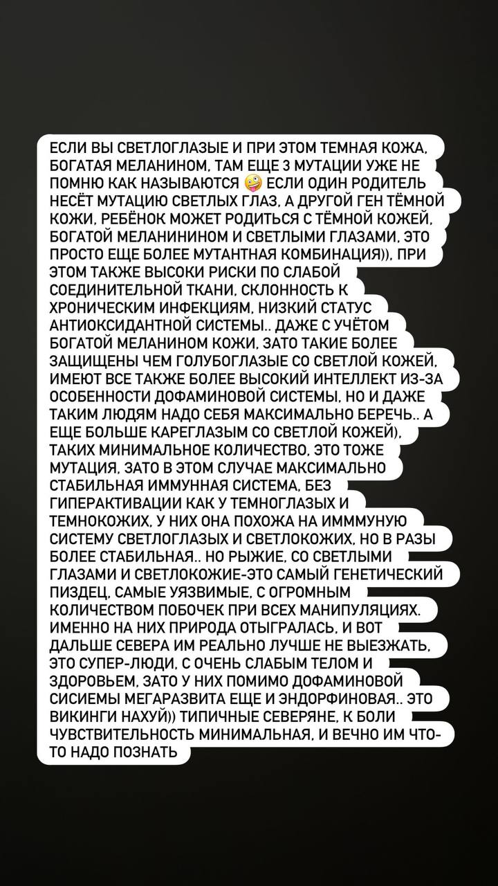 Я — черноглазая. У папы были максимально светлые глаза, он был рыжим. А у мамы — темно-зеленые. А я родилась с черными глазами, как у моей еврейской бабушки. По генетическим тестам я получила максимальную жесть: все существующие метаболические заболевания в высоких рисках (это из-за длительного еврейского кровосмешения), и все риски по дисплазия (слабый коллаген и эластин).