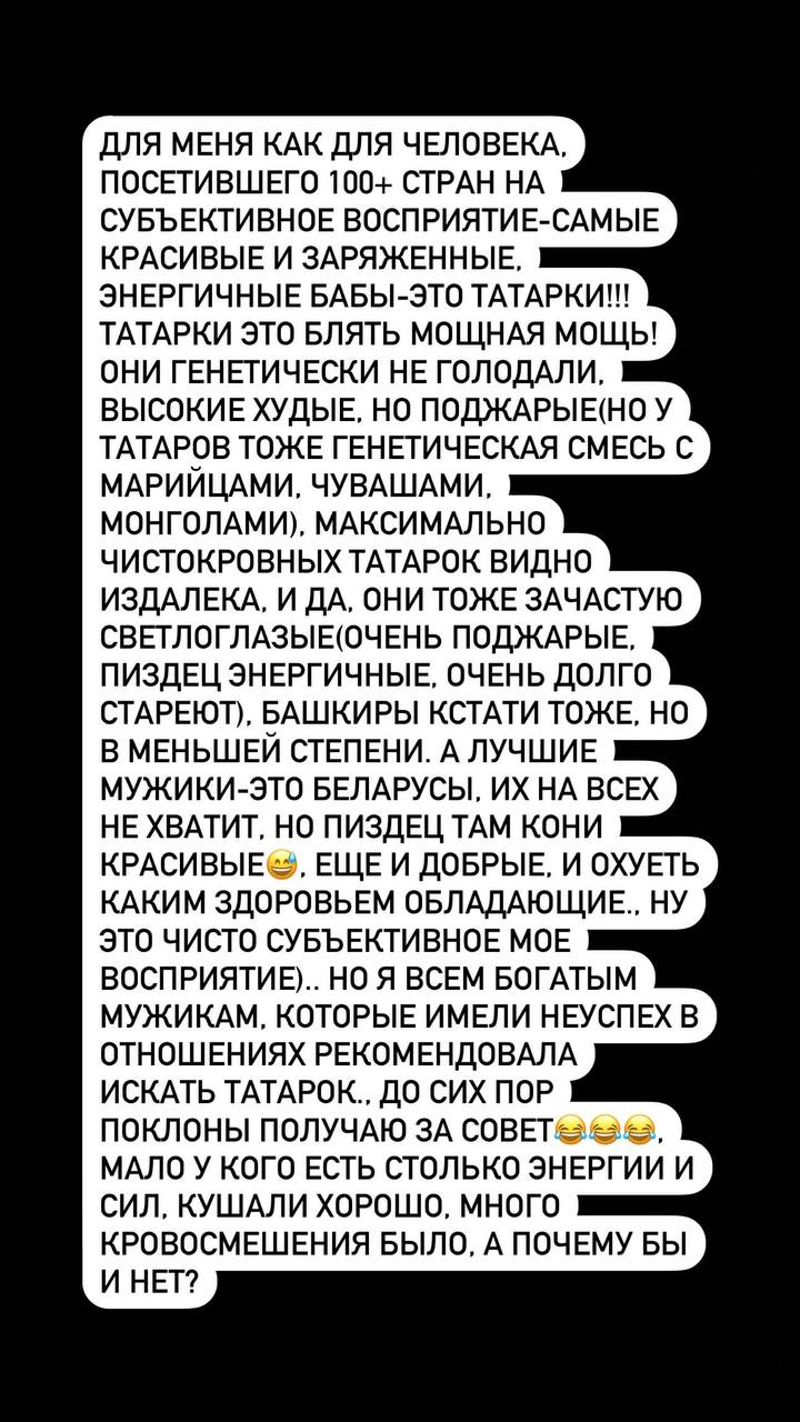 Вот почему для меня, как человека, посетившего 100+ стран, самые красивые и заряженные, энергичные бабы — это татарки, это мощная мощь! А лучшие мужики — это белорусы. Их на всех не хватит, но там просто кони красивые, еще и добрые, и с офигенным здоровьем.