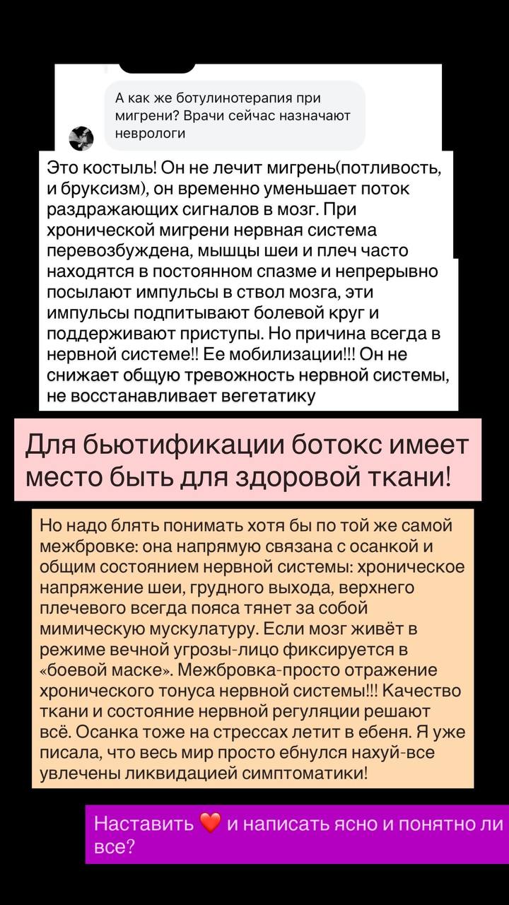 Ботокс не снижает общую тревожность нервной системы, не восстанавливает вегетатику. Ботокс при мигрени и хронических болях снижает поток раздражающих сигналов в мозг, но не восстанавливает нарушенную регуляцию, из-за чего остаётся костылём, а не решением. А для бьютификации ботокс имеет место быть для здоровой ткани!