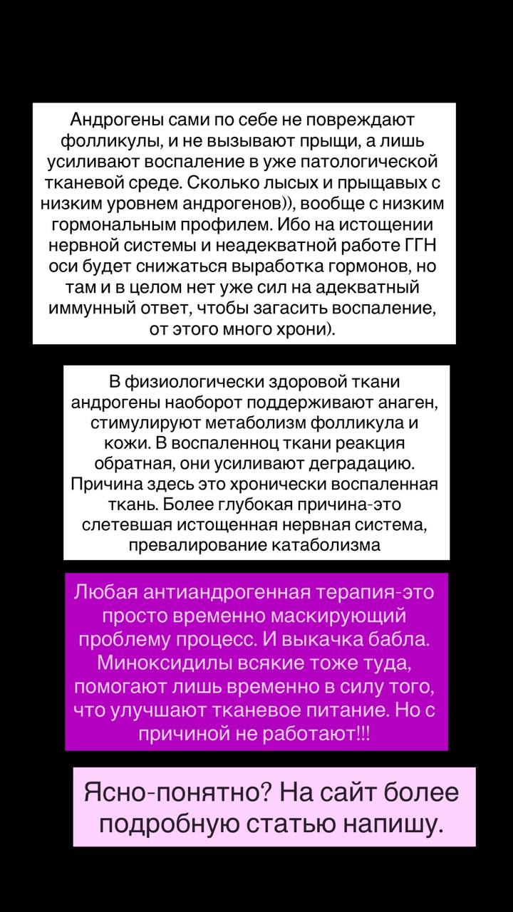 Если ткань в воспалении и катаболизме, что мы всегда видим при АГА и акне, андрогены будут усиливать процессы воспаления и распада, они просто катализаторы в этом случае, но не причина.