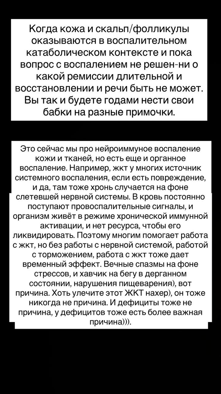 Когда кожа и скальп/фолликулы оказываются в воспалительном катаболическом контексте, и пока вопрос с воспалением не решен — ни о какой ремиссии длительной и восстановлении и речи быть не может. Вы так и будете годами нести свои бабки на разные примочки. Это сейчас мы про нейроиммунное воспаление кожи и тканей, но есть еще и органное воспаление.