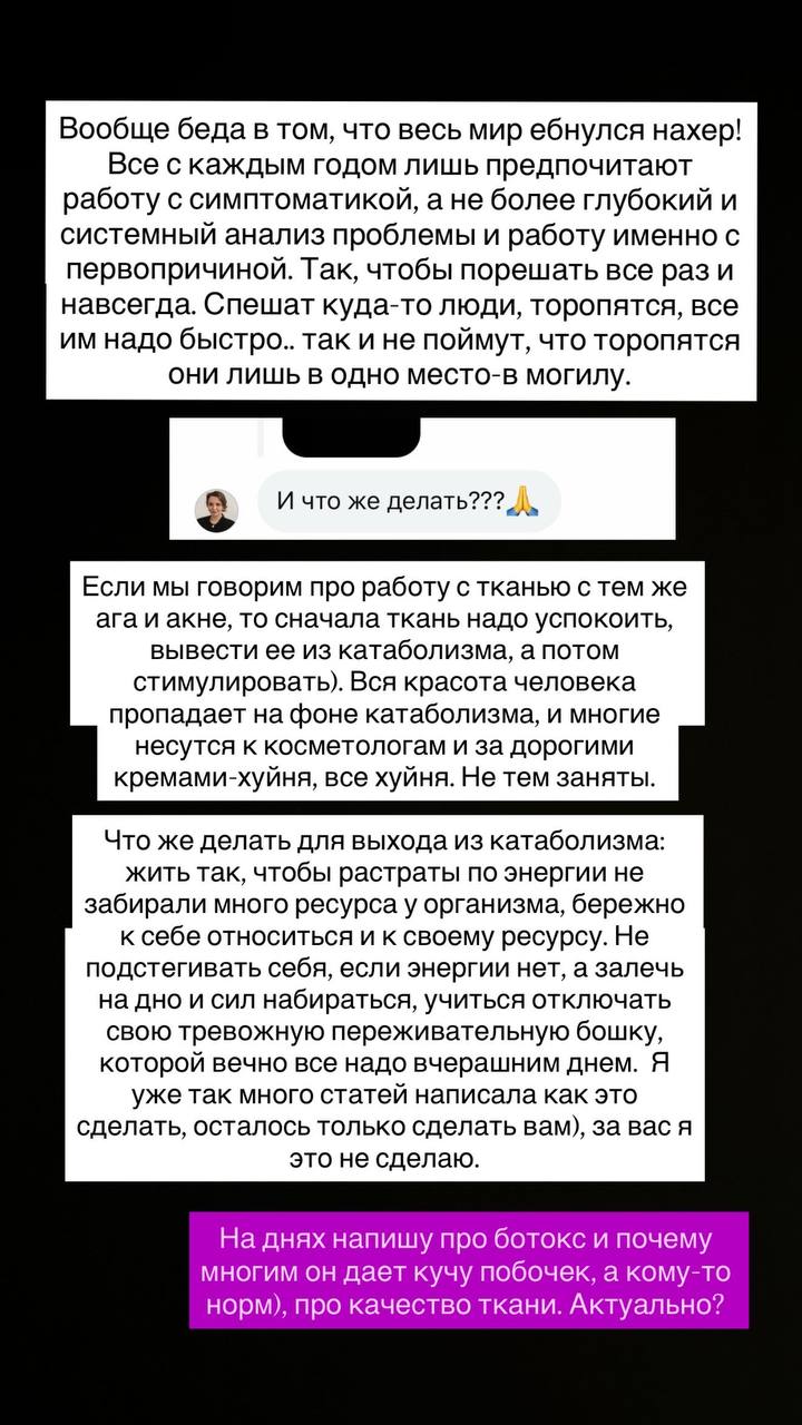 Но надо понимать хотя бы по той же самой межбровке: она напрямую связана с осанкой и общим состоянием нервной системы: хроническое напряжение шеи, грудного выхода, верхнего плечевого всегда пояса тянет за собой мимическую мускулатуру. Если мозг живёт в режиме вечной угрозы, лицо фиксируется в «боевой маске». Межбровка — просто отражение хронического тонуса нервной системы! Качество ткани и состояние нервной регуляции (как нервная система управляет сосудами, мышцами и обменом веществ в каждом конкретном участке тела) решают всё. Осанка тоже на стрессах ухудшается. Я уже писала, что весь мир просто сошёл с ума — все увлечены ликвидацией симптоматики!