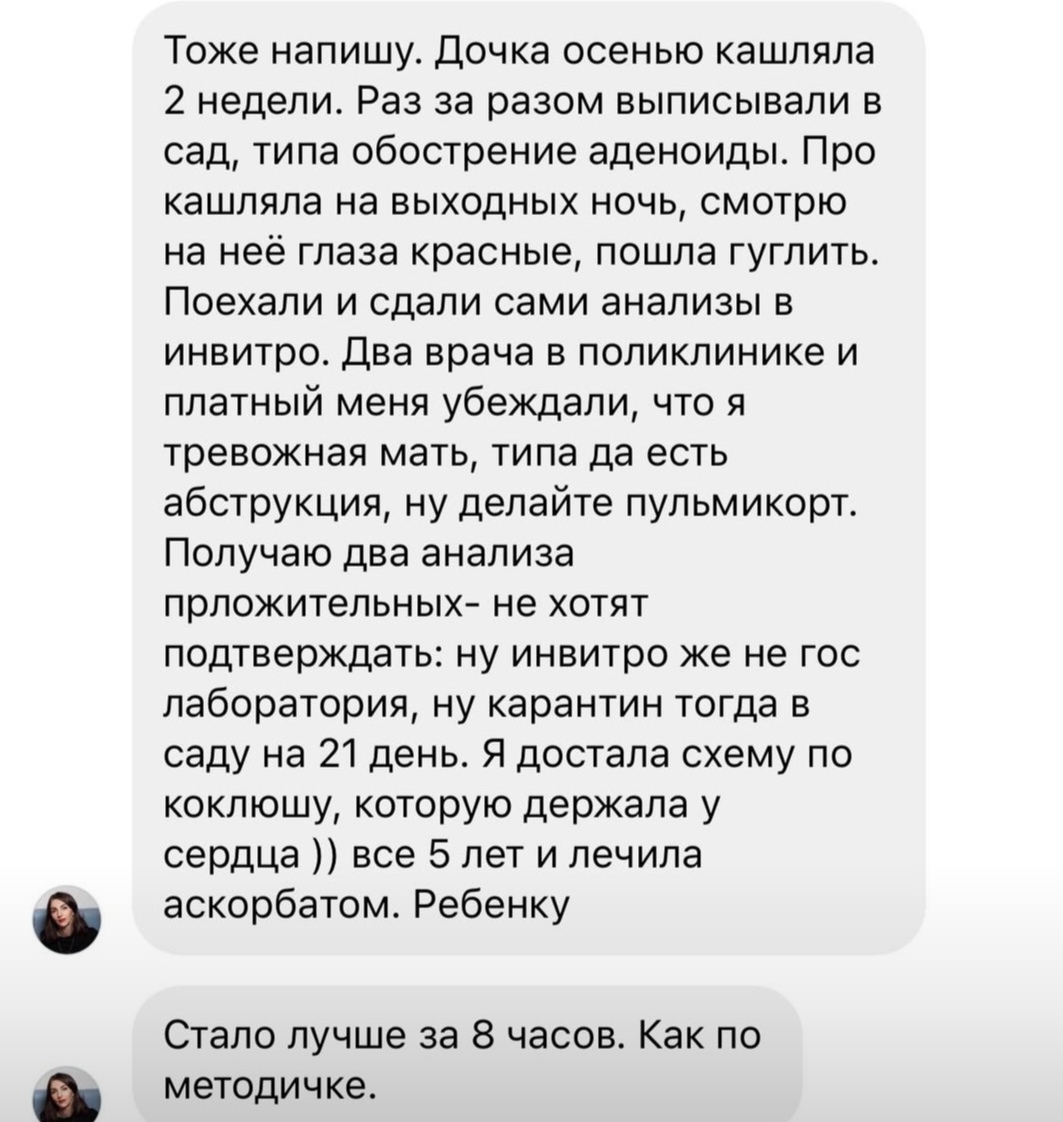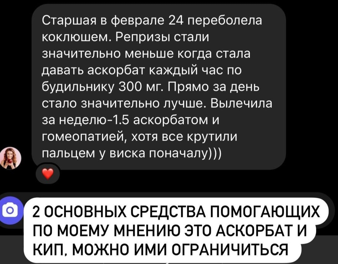 Аскорбат натрия по 300 мг на кг веса. Можно 500 мг, можно вообще до 1000 мг доводить при сильных приступа. Разделить на несколько приемов. Максимальная доза в день для взрослых и детей — 25 г. Начинать в первые дни заболевания, давать каждый час-два. При любом кашле лишним не будет. Диарея на препарате — это норма. Облегчение наступает уже в первые 8−12 часов приема. КИП 2−3 раза в день раствор 1 ампулы внутрь, 7−10 дней. При легкой и средней тяжести заболевания поехать на 2 недельки в горы 1000−1500 метров — в таких условиях палочка перестаёт размножаться. Облегчение состояния быстрое, и продолжительность заболевания снижается значительно. - 02ВАЖНО ЗНАТЬ ПРО КАШЕЛЬНикакие сиропы, разжижающие мокроту, никакие ингаляции, никакие антигистаминные строго нельзя!!! При частых приступах, непродуктивном кашле используют противокашлевые препараты центрального действия, угнетающие кашлевой центр в продолговатом мозге и подавляющие кашлевой рефлекс. Препарат выбора у детей — БУТАМИРАТ. Также можно делать касторовые компрессы от кашля, ссылка ниже в статье. Детям до 3-х лет при приступе кашля (если закашливаются) необходимо дуть в лицо — помогает остановить приступ.