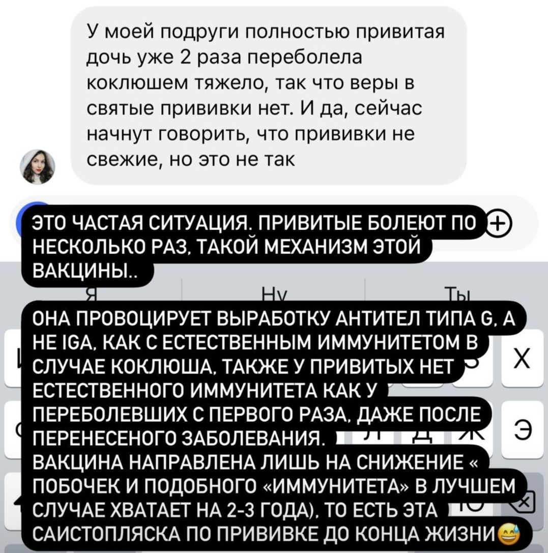 Коклюшем болеют люди всех возрастов. Иммунитет после перенесенного заболевания остается на всю жизнь. Привитые — тоже болеют, по некоторым исследованиям даже чаще, чем непривитые. Причем прививка мешает формированию нормального иммунитета к коклюшу в дальнейшем после перенесенного заболевания.