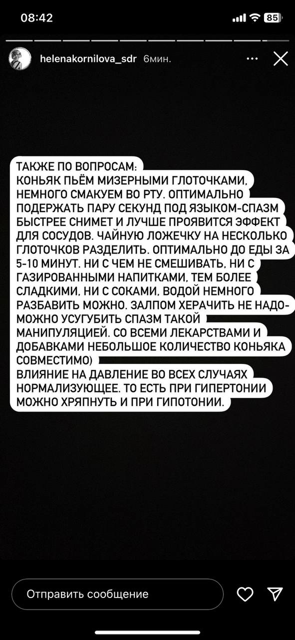 Внимание: коньяк важно пить мизерными глоточками, смакуя, оптимально — подержать пару секунд под языком (быстрее снимет спазм и лучше проявится эффект для сосудов). Чайную ложечку разделить на несколько глоточков. Лучше всего — за 10−15 минут до еды. Ни с чем не смешивать! Ни с газированными напитками, ни со сладкими, ни с соками. Можно немного разбавить водой. Залпом пить не надо — можно усугубить спазм. Со всеми лекарствами и добавками небольшое количество коньяка совместимо. Влияние на давление во всех случаях нормализующее, то есть и при гипертонии можно выпить, и при гипотонии.