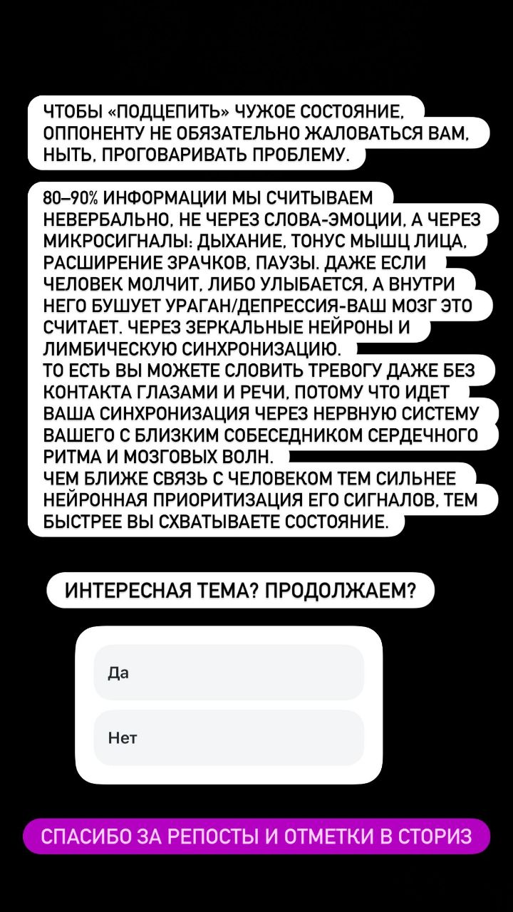 Поступил вопрос от подписчицы: «А если я жизнерадостный, спокойный, нетревожный человек, то почему это не особо передается живущему со мной тревожному человеку? Почему она меня не зеркалит? Или только „болячки“ цепляются?». Ответ: любые состояния «заразны»! Эволюционно этот механизм возник для того, чтобы стая действовала как единое целое.