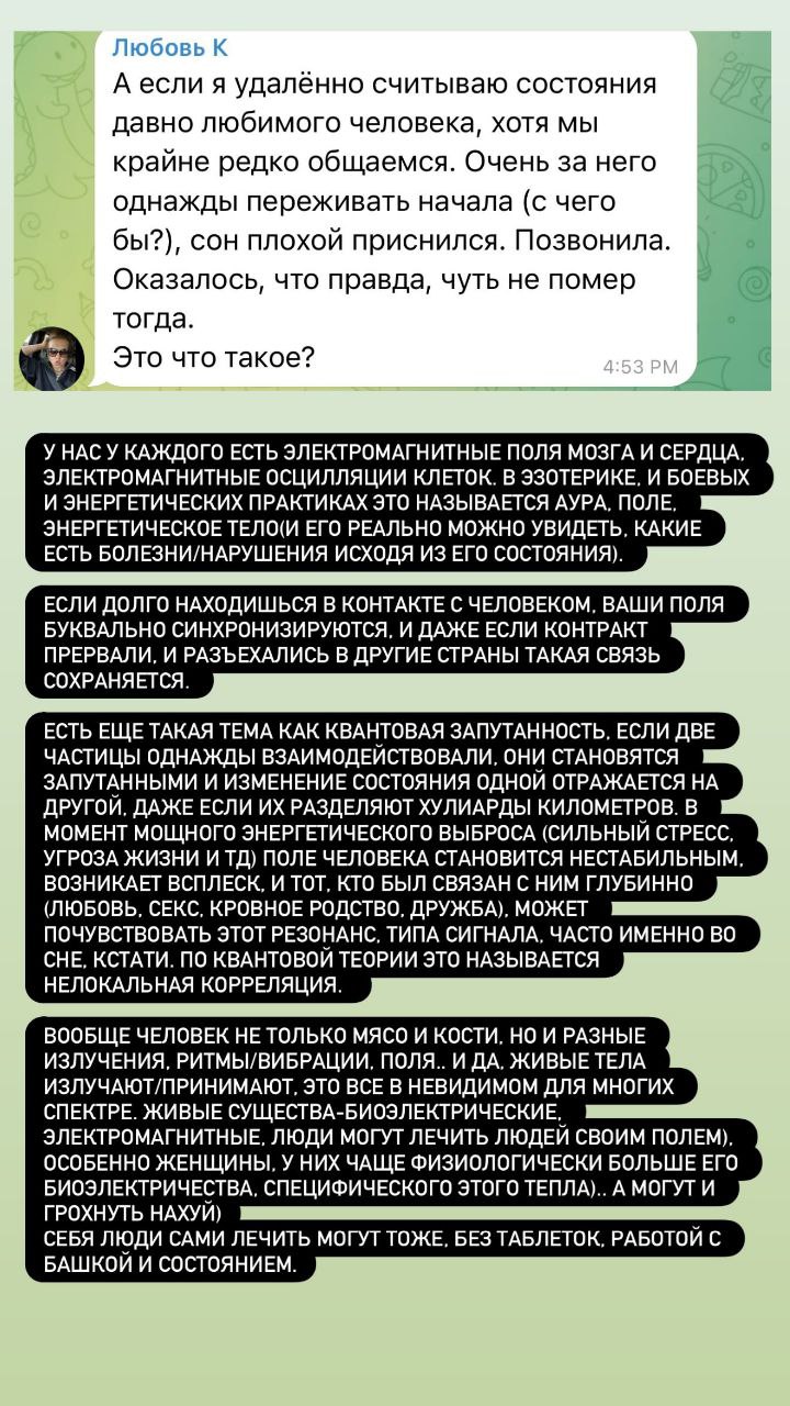 Ещё вопрос задали: «А если я успешно считываю состояния давно любимого человека, хотя мы крайне редко общаемся. Очень за него переживать начала (с чего бы?), сон плохой приснился. Позвонила. Оказалось, что правда, чуть не помер тогда. Это что такое?». Ответ: электромагнитные поля мозга и сердца, электромагнитные осцилляции клеток. В эзотерике, боевых и энергетических практиках это называется «аура», «поле», «энергетическое тело» (и его реально можно увидеть, какие есть болезни/нарушения, исходя из его состояния).